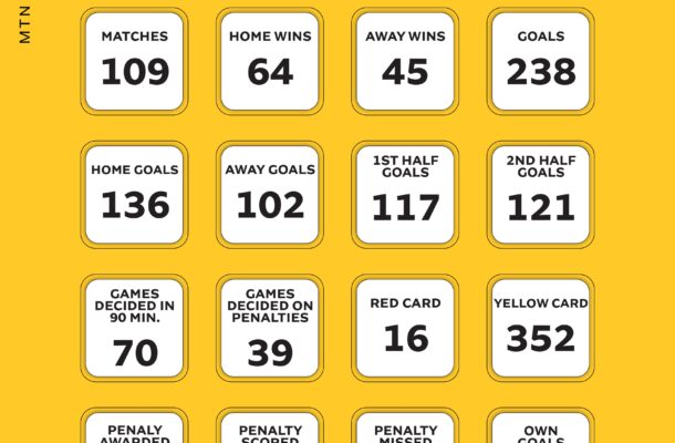 After 109 matches played from the preliminary stage to the final in the prestigious MTN FA Cup this season, 64 home wins were recorded and 45 away wins. A total of 238 goals were scored, with 136 goals scored at home and 102 goals scored away from home; 8 own goals were also recorded. While 117 goals came in the first half, the second half witnessed 121 goals. Seventy games were decided in regulation time, and 39 games were decided on penalties. Twenty penalties were successfully converted out of the 22 awarded.