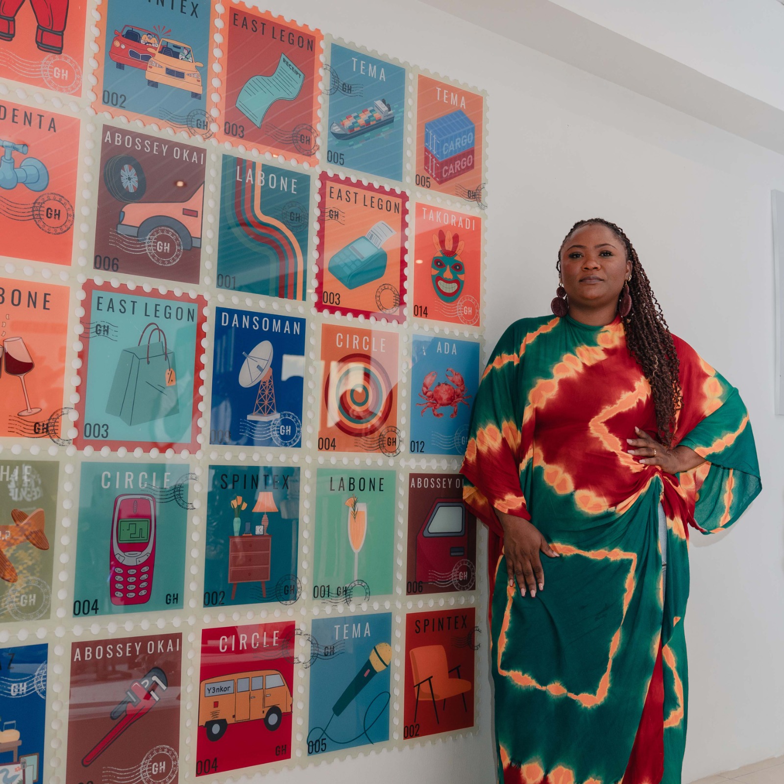 While the exhibition reflects her broader artistic journey and captures key Ghanaian cultural moments, the centrepiece of the show is her evolving “stamps collection.” The grid — currently made up of 25 pieces — features stylised, cheeky interpretations of Ghanaian suburbs, using quirky icons and playful visuals to highlight the identity of each location.