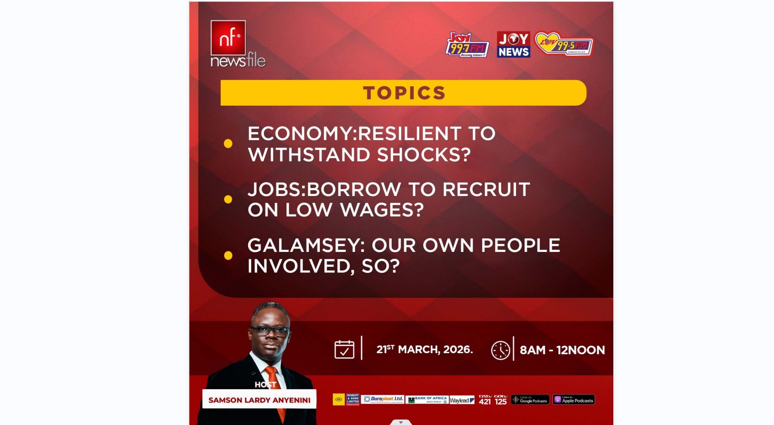 Ghana’s most influential news analysis programme, Newsfile, returns to the airwaves on JoyNews and Joy FM on Saturday, 21st March 2026, with a heavy-hitting agenda focused on the nation’s economic stability and the persistent crisis of illegal mining (galamsey).