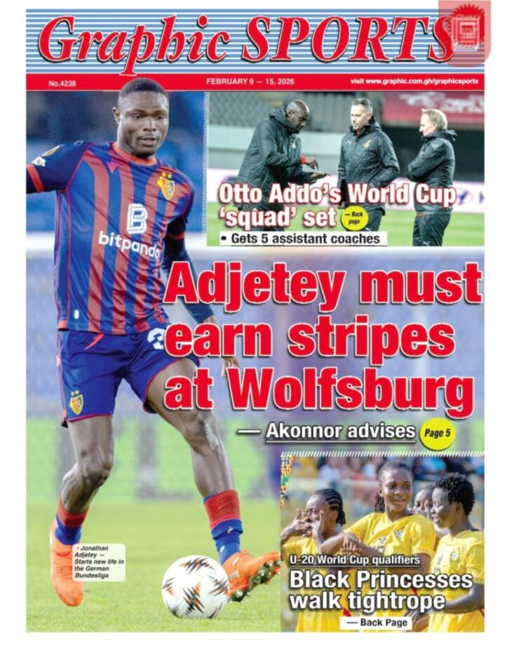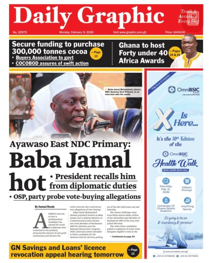Home News Today’s Front pages: Monday, February 9, 2026 News Today’s Front pages: Monday, February 9, 2026 By Ghana Newss - 02/09/2026 60 0 FacebookTwitterWhatsAppLinkedinEmailPrintTelegram Myjoyonline.com brings you the front pages of the various newspapers across the country. RELATED ARTICLESMORE FROM AUTHOR Ghana to mark Africa Safer Internet Day on February 10 ‘A Tax For Galamsey’: Dr Manteaw warns NDC against shielding ‘galamsey’ DCEs Policeman killed in bloody robbery on Zebilla–Widnaba road - Advertisement -Don't Miss Students who engage in inter-hall fights will be sacked – UCC Acting Vice Chancellor... Ghana Newss - 02/09/2026 Maccasio crowned Overall Artist of the Year at maiden Ghana Northern Music Awards 2025 Ghana Newss - 02/09/2026 Kelvynboy survives accident, suffers fractured ankle Ghana Newss - 02/07/2026 Halle Berry confirms engagement to boyfriend Van Hunt Ghana Newss - 02/07/2026 Why I Won’t Dance to Promote My Movies Ghana Newss - 02/09/2026