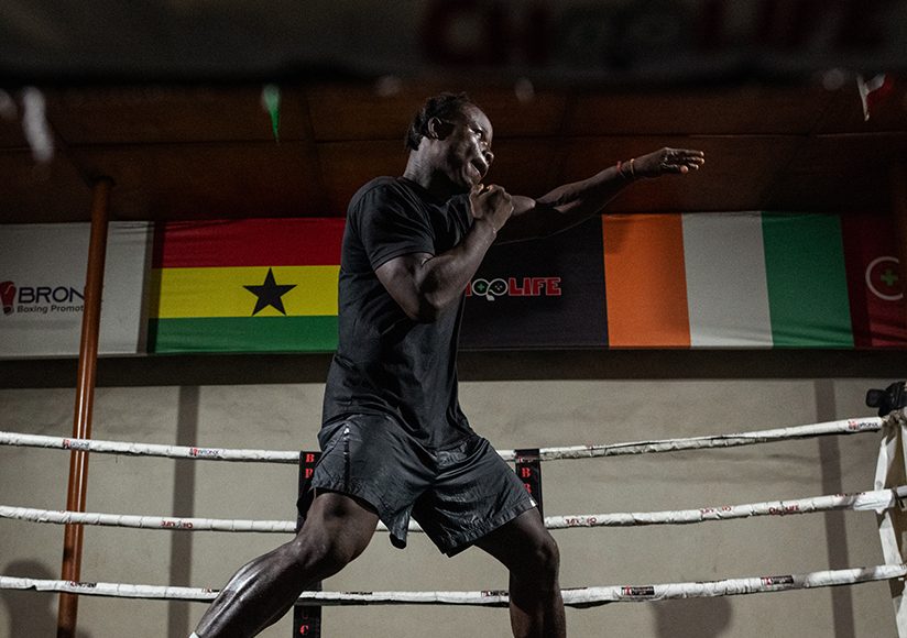 Stephen “Dominant” Coffie trains alone in the ring at Bronx Boxing Gym in the Bukom district of Accra, Ghana. He continues his training regiment even without knowing when his next match will be. Boxers like Coffie rely on local promoters and matchmakers to setup matches and fill the financial gap left by suspended sanctioned professional matches. (Photo by Kalani Chai-Andrade/Joy Sports)
