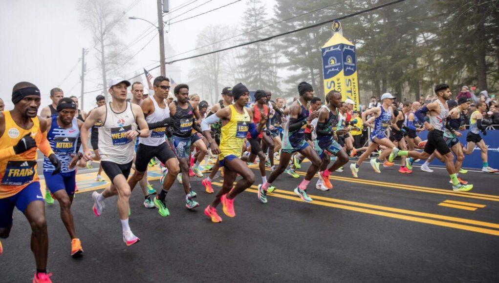 The men’s professional field gets underway at the 127th Boston Marathon. (Robin Lubbock/WBUR)