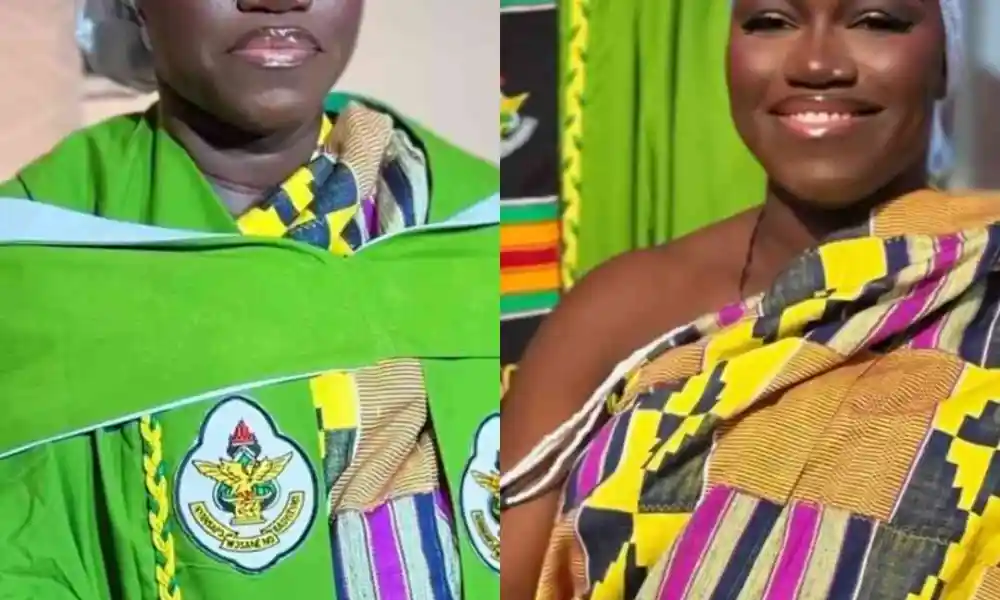 A reel creator and mobile videographer, live_events_with_ paakojo1, shared a video capturing special moments from her graduation day. In the video, the queen-mother is first seen beautifully dressed in a distinctive kente cloth and white headscarf, reflecting the traditional appearance associated with queen-mothers. She is later shown in her graduation gown, confidently making her way to the ceremony grounds.