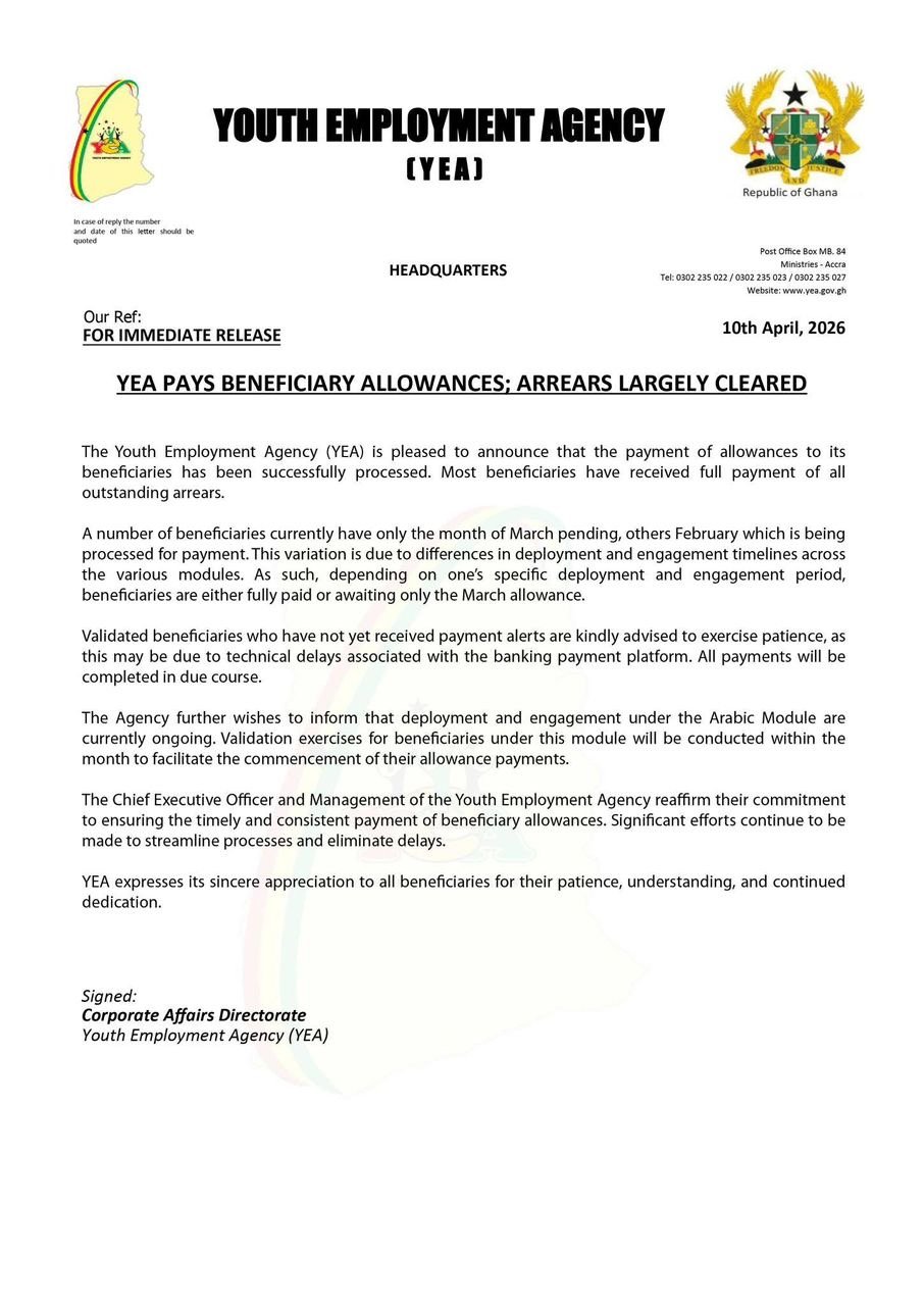 The Agency also expressed appreciation to beneficiaries for their cooperation, stating, “YEA expresses its sincere appreciation to all beneficiaries for their patience, understanding, and continued dedication.”